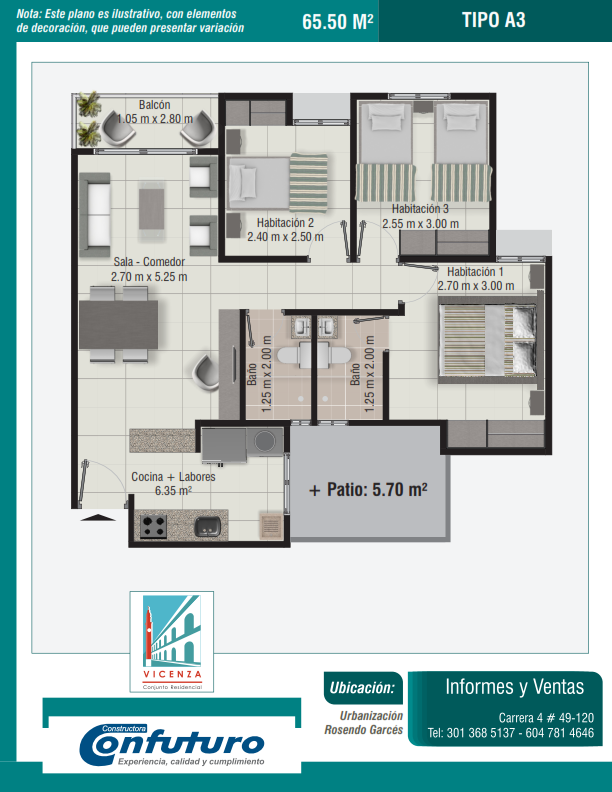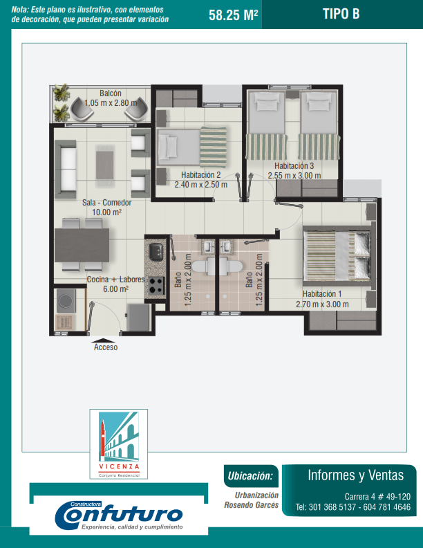 Apartamentos de tres alcobas, dos baños, sala-comedor, cocina, zona de labores y balcón. Con áreas desde los 58.25 m² hasta los 65.50* m² (*con patio en el primer nivel).