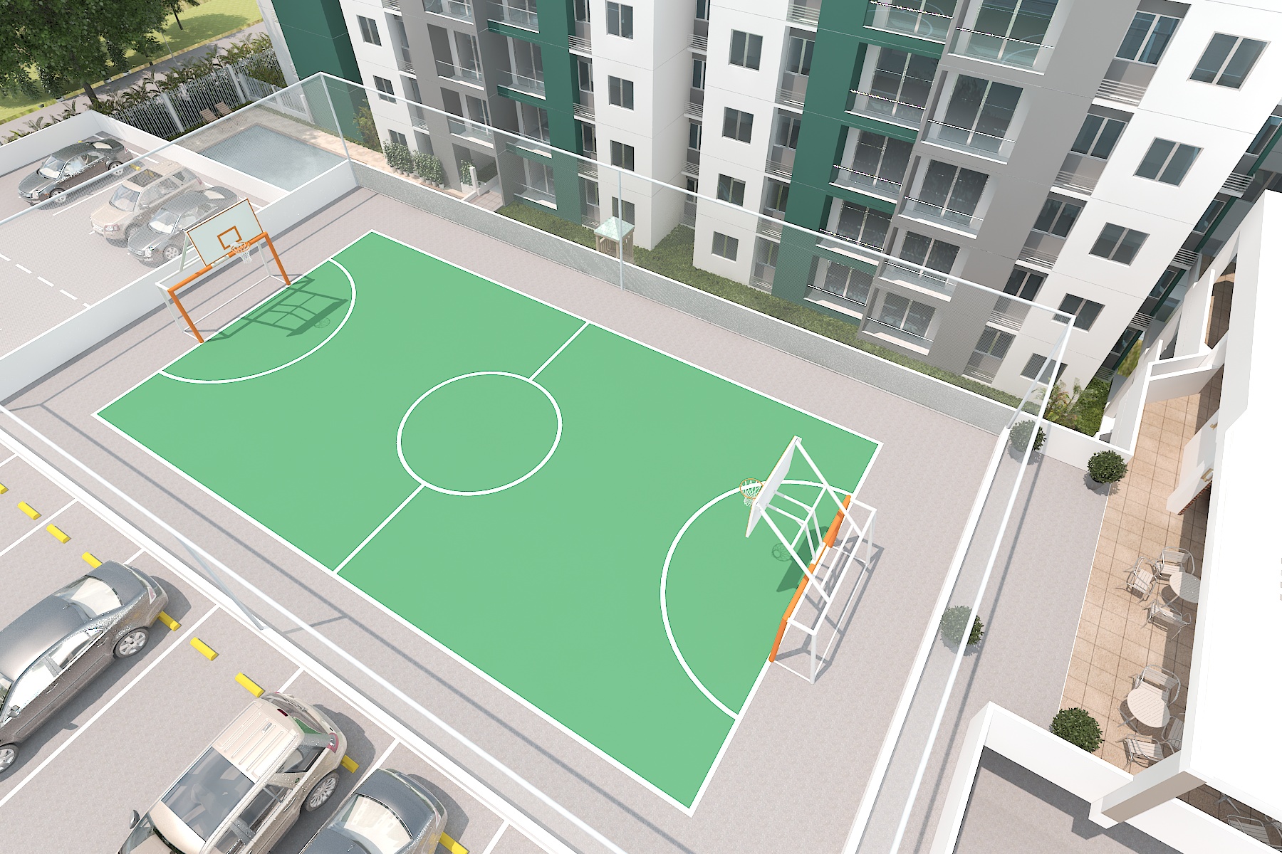 Está conformado por dos torres de 12 pisos, parqueaderos privados, red contraincendios, un salón social, terraza BBQ, piscina para adultos y niños, juegos infantiles, gimnasio semidotado, cancha múltiple y planta eléctrica en zonas comunes.