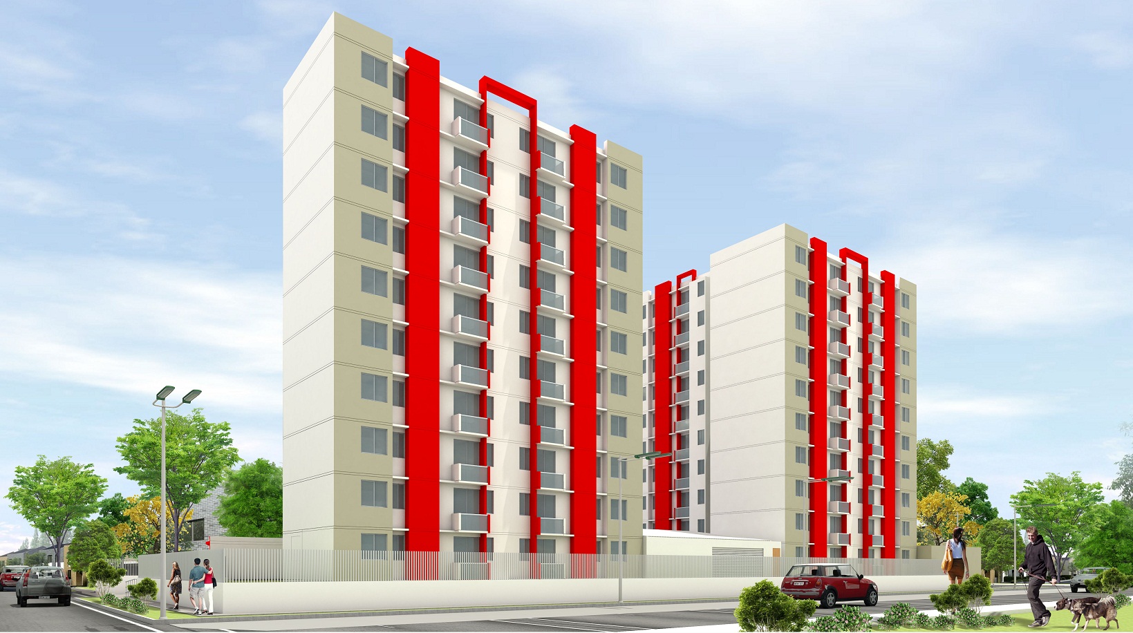 Está conformado por 2 torres de 10 pisos cada una, parqueaderos, red contraincendios, un salón social abierto, piscina para adultos y niños, juegos infantiles y planta eléctrica en zonas comunes.