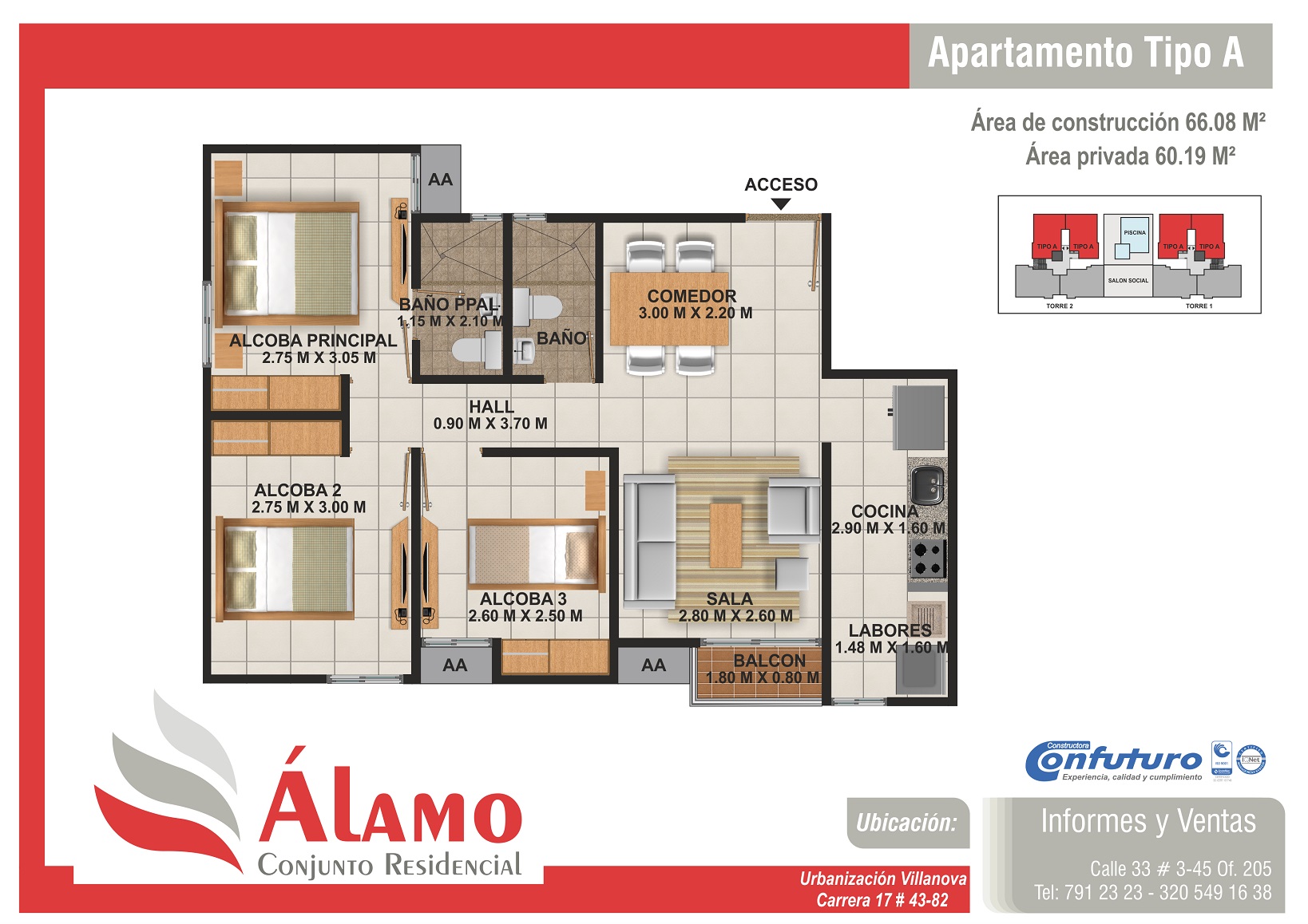 Apartamentos de tres alcobas, dos baños, sala-comedor, cocina, zona de labores y balcón. Con áreas de 66.08m2.